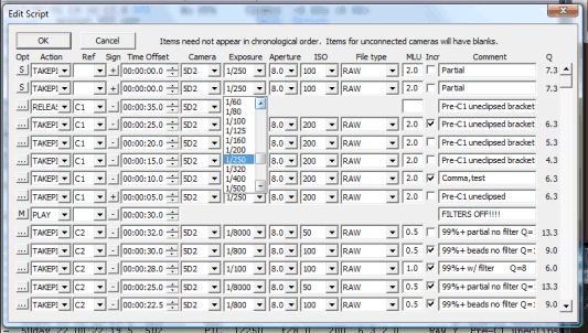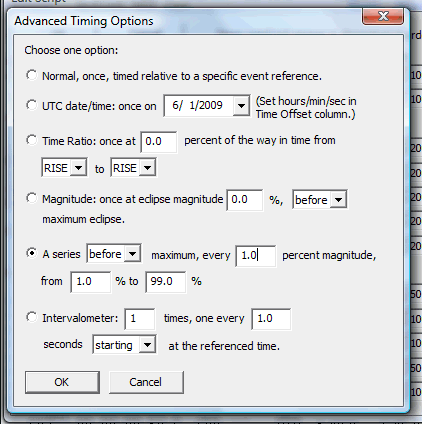 - Calculation and display of eclipse local circumstances, with capability to reference camera script items to eclipse events ("5 seconds after second contact", "at 50% magnitude", etc.) or use absolute UTC date/times. See screenshot of advanced timing options.